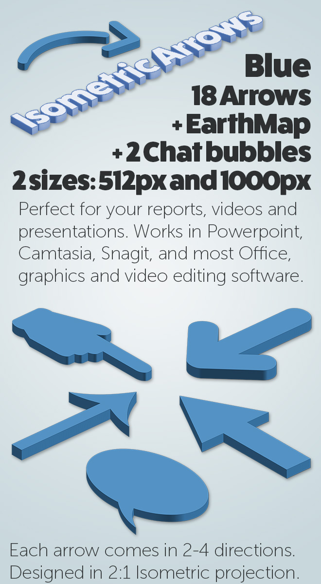 18 arrows, one earth-map and two chat bubbles come in two different sizes. Each arrow come in 2-4 directions. The isometric arrows was designed in 2:1 isometric projection.