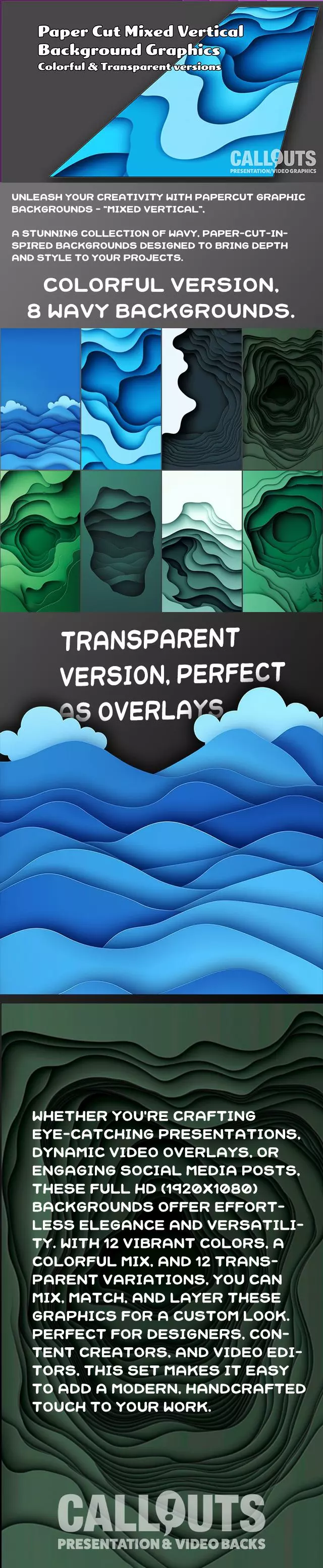 These handcrafted, vertical-style paper-cut backgrounds bring dimension and flair to your projects. Featuring 8 colored versions, and five transparent variations, this pack is ideal for vertical formats like stories and mobile content.