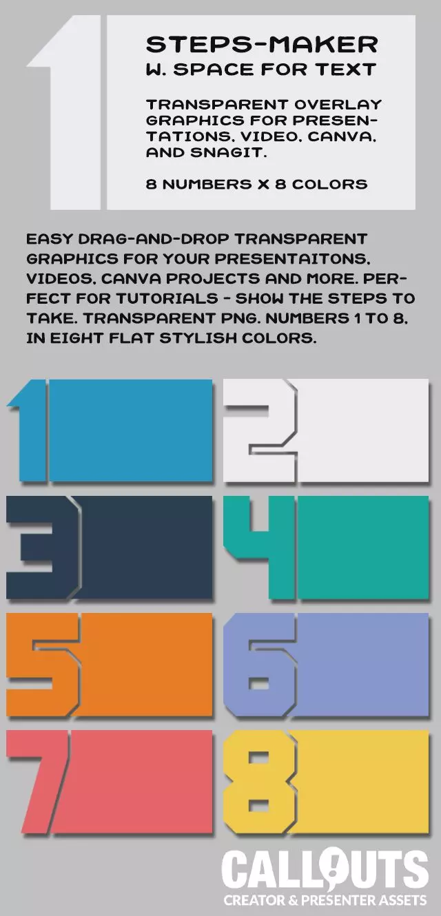 This versatile graphics pack includes 64 transparent PNG graphics, featuring numbers 1 through 8 in 8 distinct colors, allowing you to clearly outline step-by-step instructions, tutorials, workflows, or sequences. Each graphic includes dedicated space for custom text or labels, making it easy to adapt to your needs.