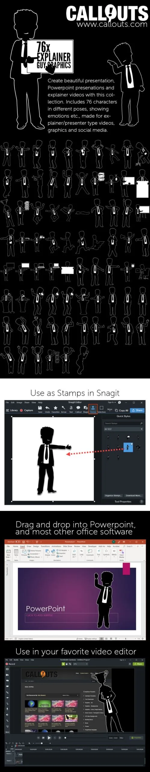 The collection was developed specifically to create presentations and explainer videos and to cover many situations you may encounter in your story telling.