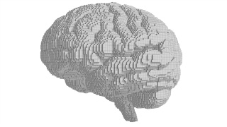 Animated video of a voxel styled brain, seen from above: The brain is grey/white with a white background and placed on the center. This video is loopable.