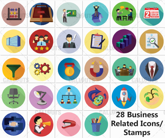 28 flat round Business related icons/stamps that can be used in most graphics applications including Snagit. Picturing different business related occasions and items.