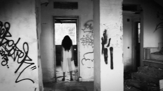 Camera pan of a haunted house or abandoned building. A girl in a white dress, with hair covering the face character is standing in a doorway. Camera pans back to center on scary girl. Howling wind sound. The video is in black and white.