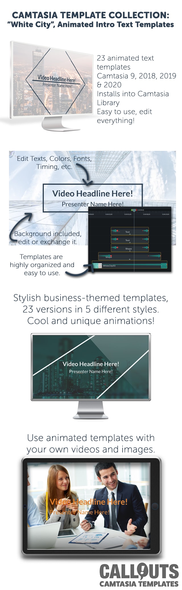 We are happy to introduce our newest Camtasia template collections, “White City”, animated intro text templates.