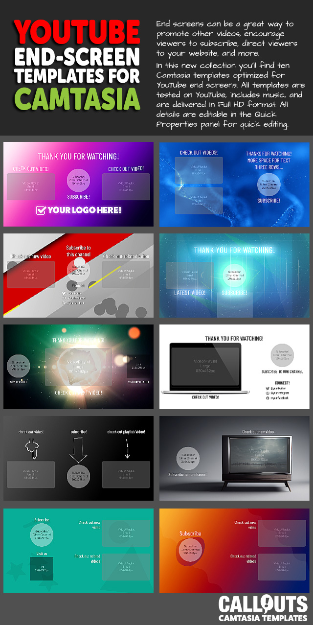 Camtasia YouTube end-screen templates are here! In this new collection you’ll find ten Camtasia templates optimized for YouTube end screens.