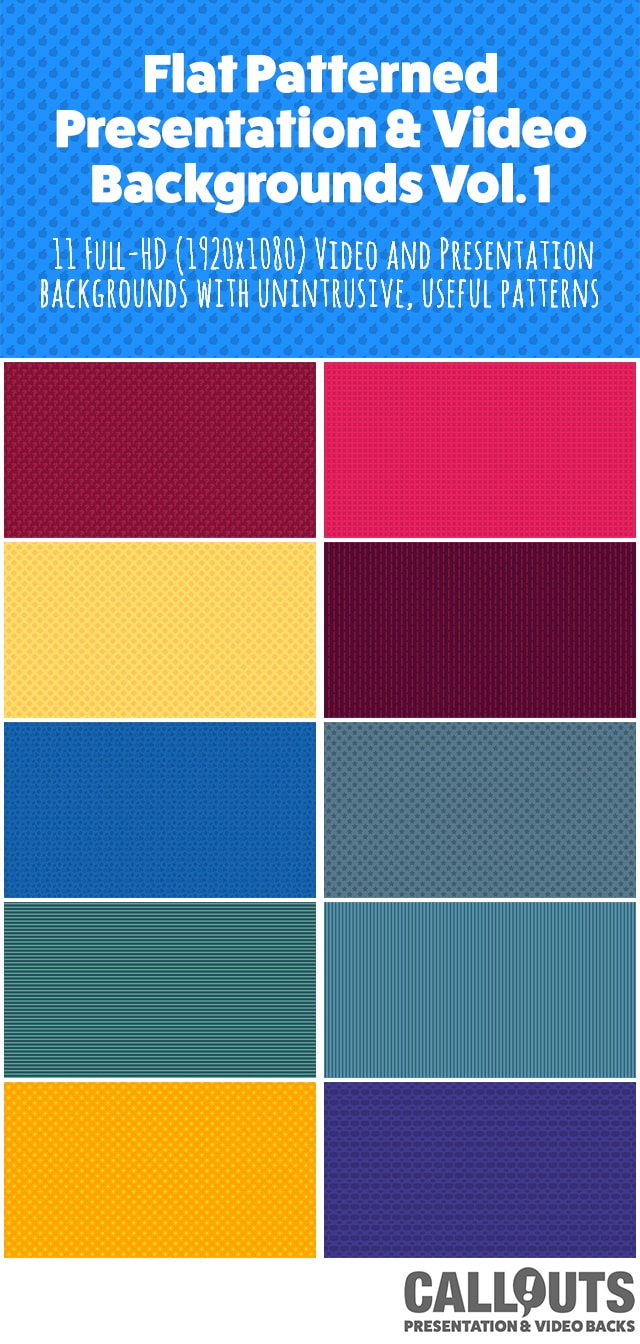 Flat patterned background graphics for your presentations and videos. In this collection you find 11 backgrounds with different an unobtrusive patterned theme. The idea for this collection was to create a set of useful backgrounds, that drives a point across without disrupting the text message you want to put across.