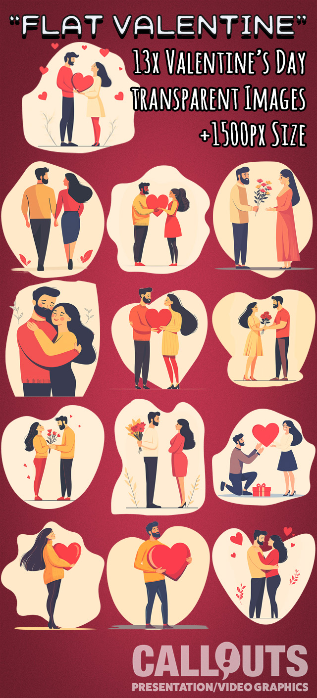 Celebrate love with this charming collection of Flat Valentine Romantic Graphics! This set includes 13 high-quality transparent PNG graphics, featuring couples in sweet and affectionate moments—holding hands, exchanging hearts, hugging, and more.