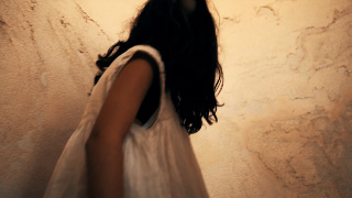 A ghostlike girl in white dress walks up the stairs of a haunted or abandoned building and into the light. Melancholic violin background music.