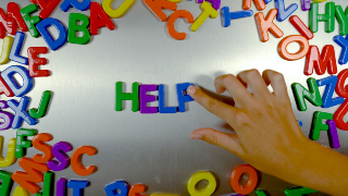 Teenager Girl’s hand writes “Help” with fridge magnets or silver colored fridge door. Footage has been sped-up.