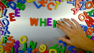 Teenager Girl’s hand writes “When” with fridge magnets or silver colored fridge door. Footage has been sped-up.