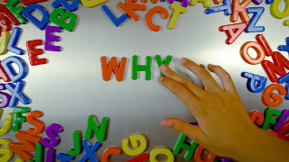 Teenager Girl’s hand writes “Why” with fridge magnets or silver colored fridge door. Footage has been sped-up.