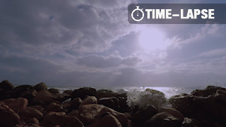 Time-lapse footage of ocean with rocks and clouds.