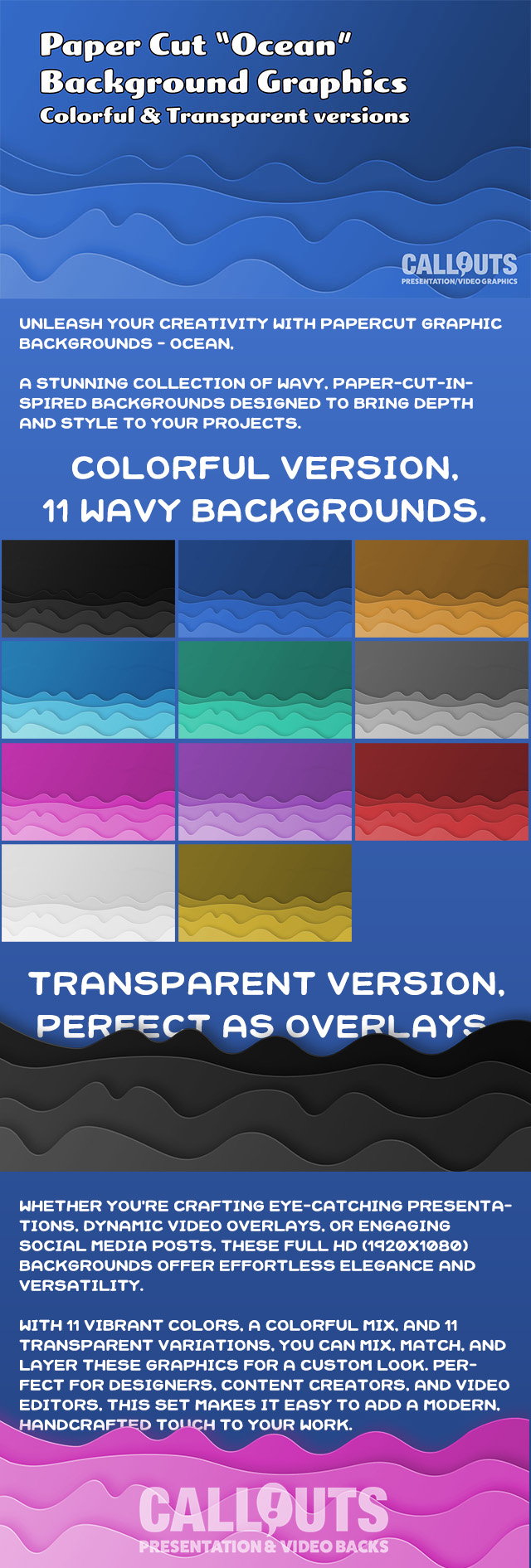 Unleash your creativity with PaperCut Graphic Backgrounds – Ocean, a stunning collection of wavy, paper-cut-inspired backgrounds designed to bring depth and style to your projects. Whether you’re crafting eye-catching presentations, dynamic video overlays, or engaging social media posts, these Full HD (1920×1080) backgrounds offer effortless elegance and versatility. See a preview below.