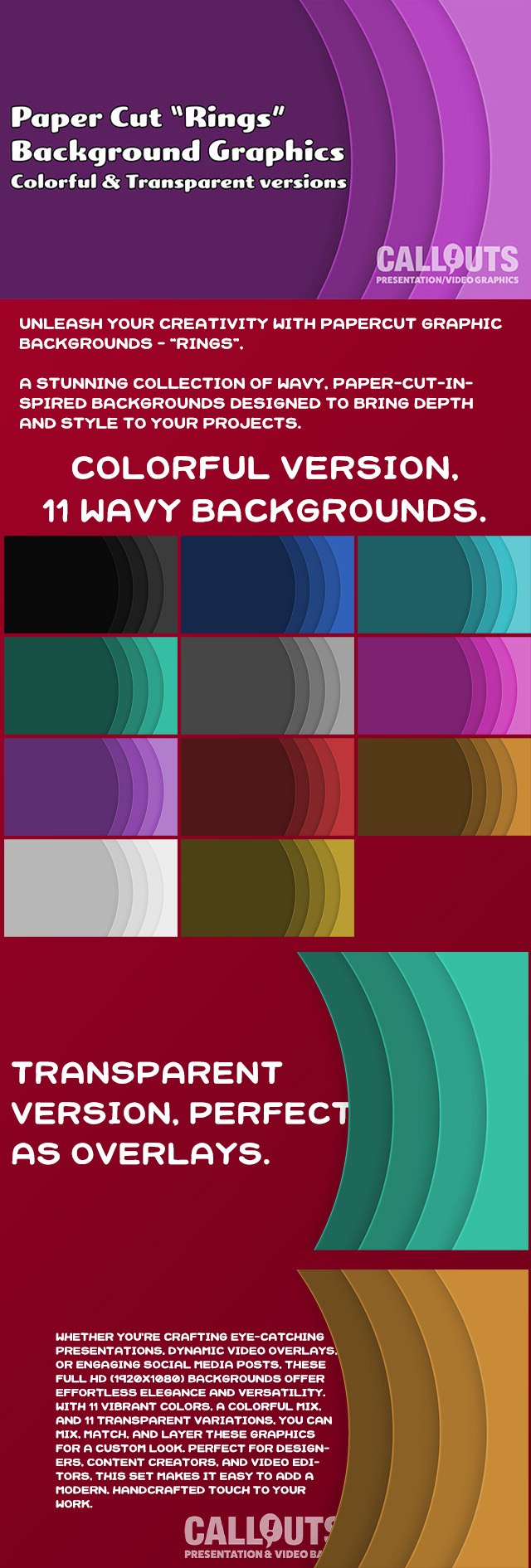 Unleash your creativity with PaperCut Graphic Backgrounds – Rings, a stunning collection of wavy, paper-cut-inspired backgrounds designed to bring depth and style to your projects. Whether you’re crafting eye-catching presentations, dynamic video overlays, or engaging social media posts, these Full HD (1920×1080) backgrounds offer effortless elegance and versatility. See a preview below.