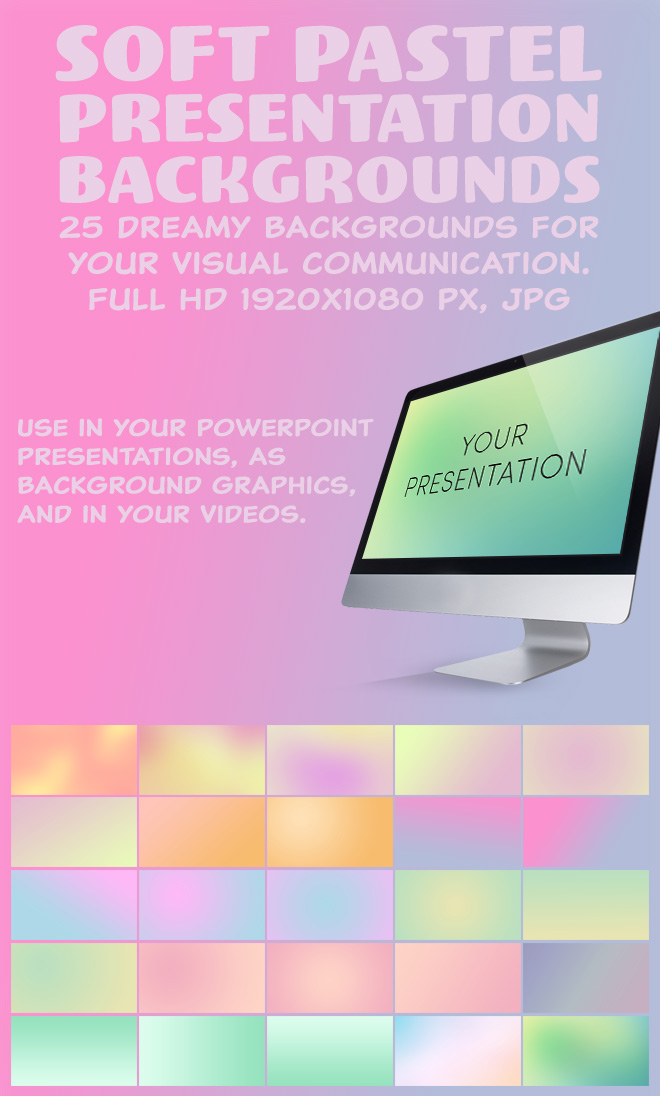 25 soft pastel backgrounds for your visual communication. The soft cloudy abstract pastels with pink, light blue and light green dominant colors can be used as backdrops in your presentations, graphics and videos.