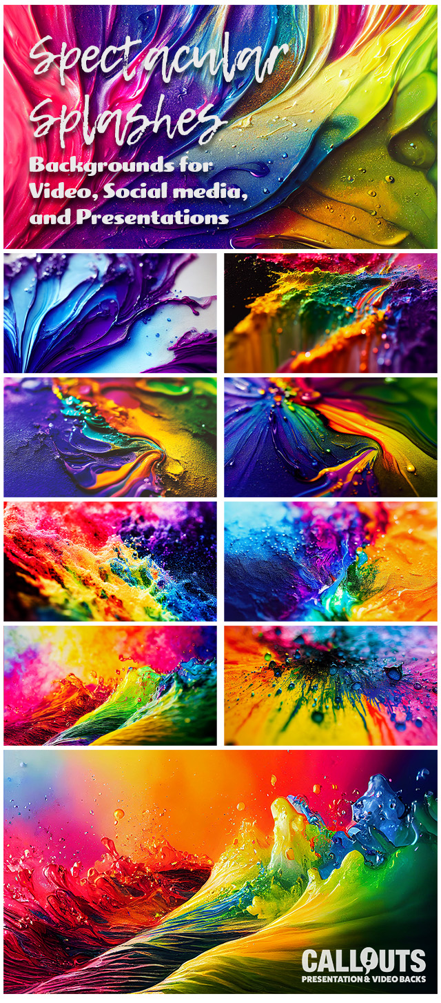 Closeups of wonderful rainbow-colored splashes of paint. Ten graphics backgrounds are included in the most amazing colors.