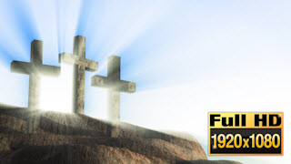 Slowly zooming in on 3 crosses on a cliff. Behind the crosses light rays appear.